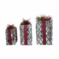 Our bright set of 3 lighted gift boxes Christmas decorations create the look of Christmas in the yard, on the porch or anywhere all season long. Each set gives you 3 identically decorated boxes in graduated sizes for a dramatic display. The lighted Christmas presents have 100 lights arranged inside, producing a warm, enchanting effect when lit. These lighted Christmas boxes are perfect as Christmas yard decorations, Christmas outside decorations, indoor Christmas decorations, place anywhere to create a festive and merry atmosphere!
