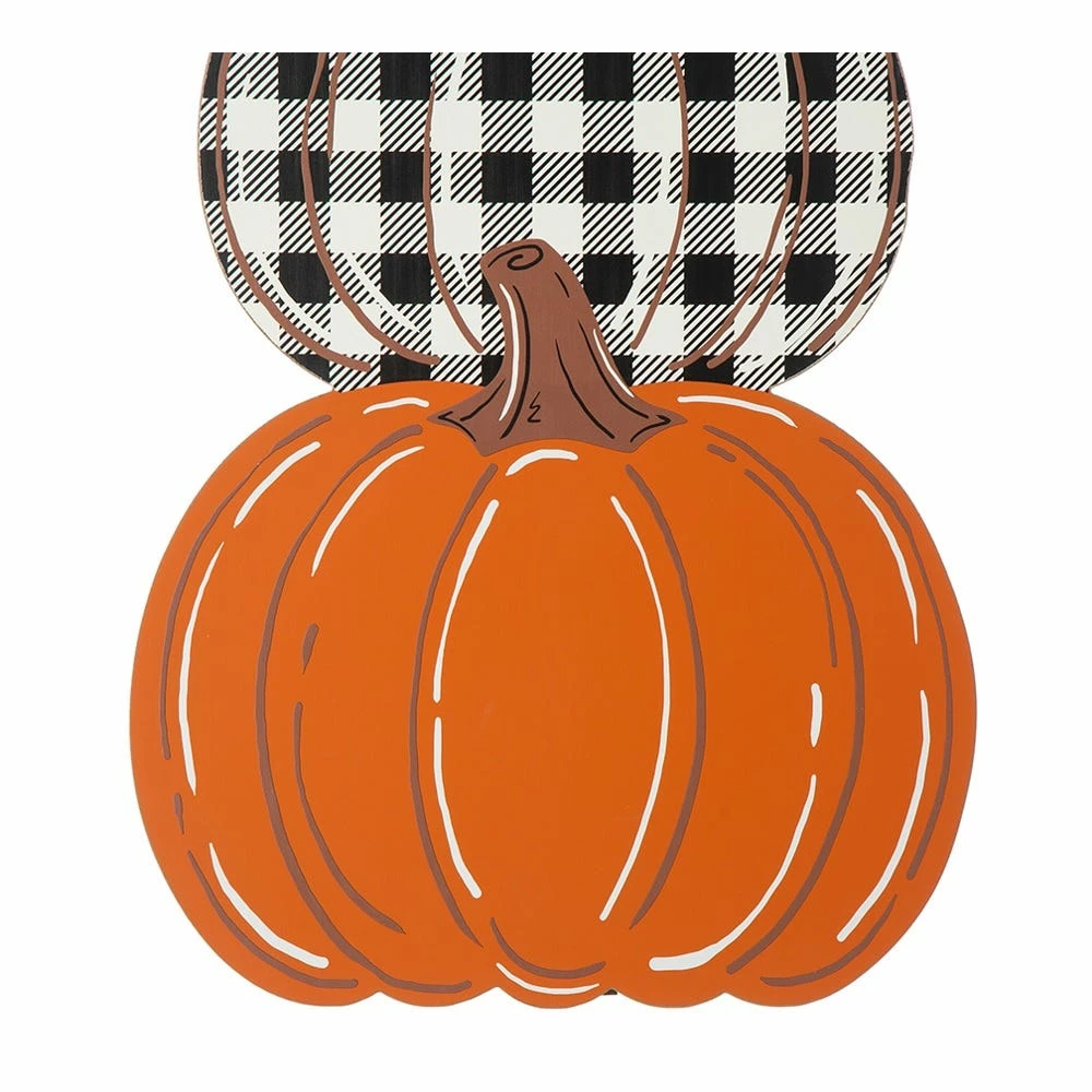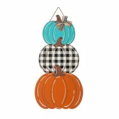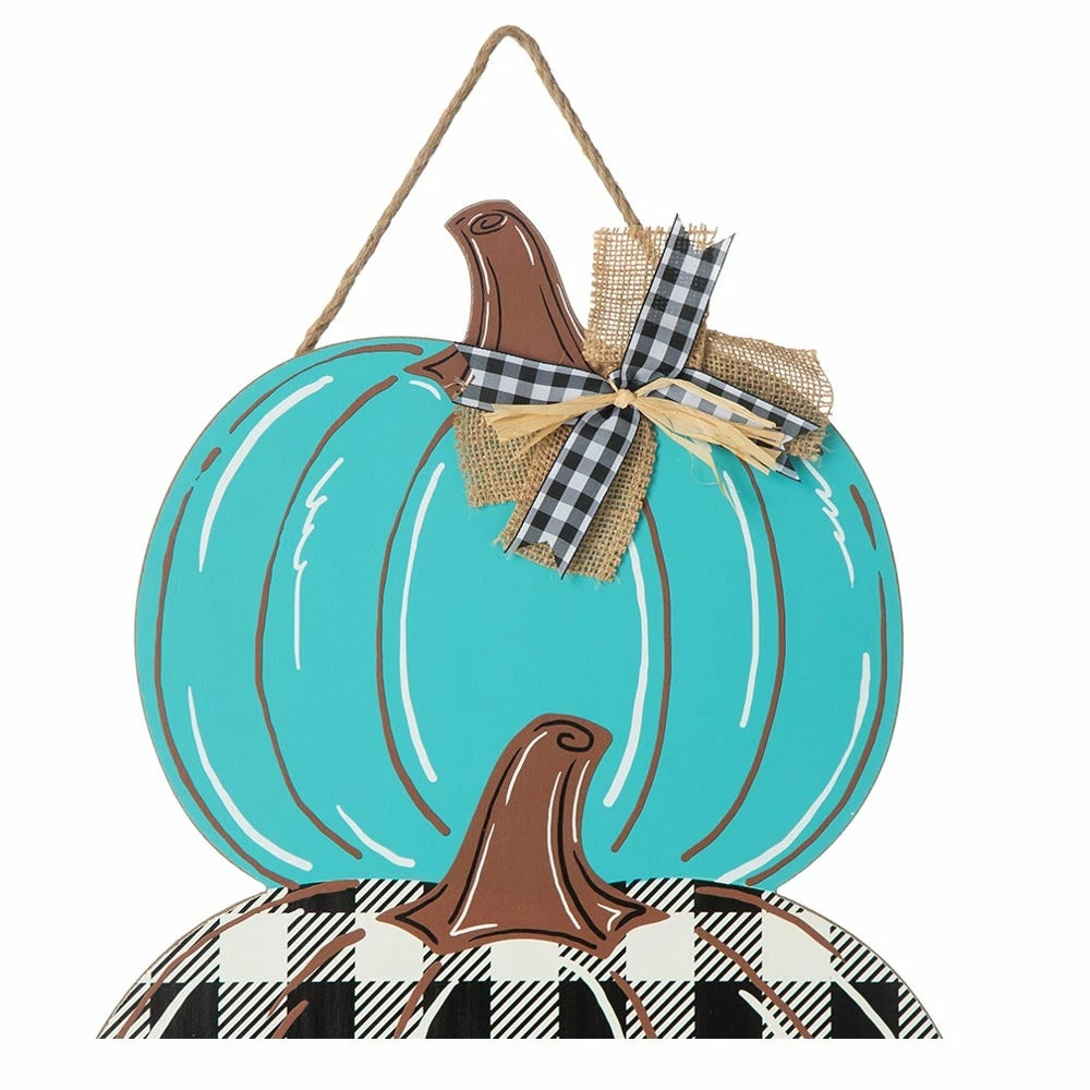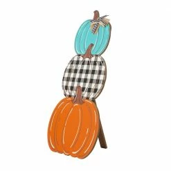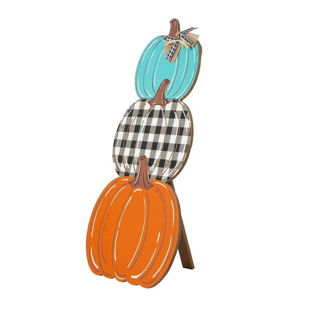 This is a wooden stack pumpkins porch leaner. It features in bule pumpkin,bufflo pumpkin, and orange pumpkin.