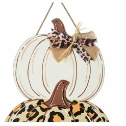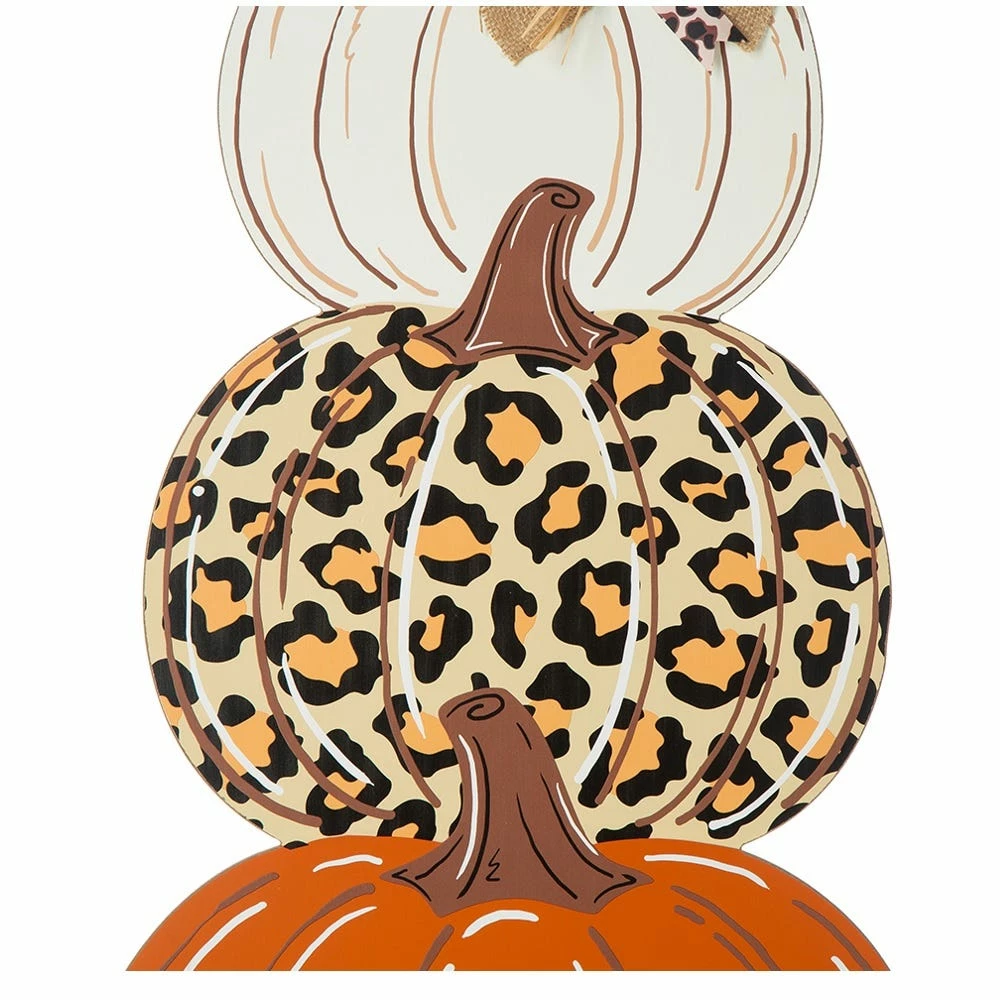 This is a wooden stack pumpkins porch leaner. It features in white pumpkin,leopard pumpkin, and orange pumpkin. The material is 100% MDF.