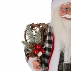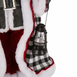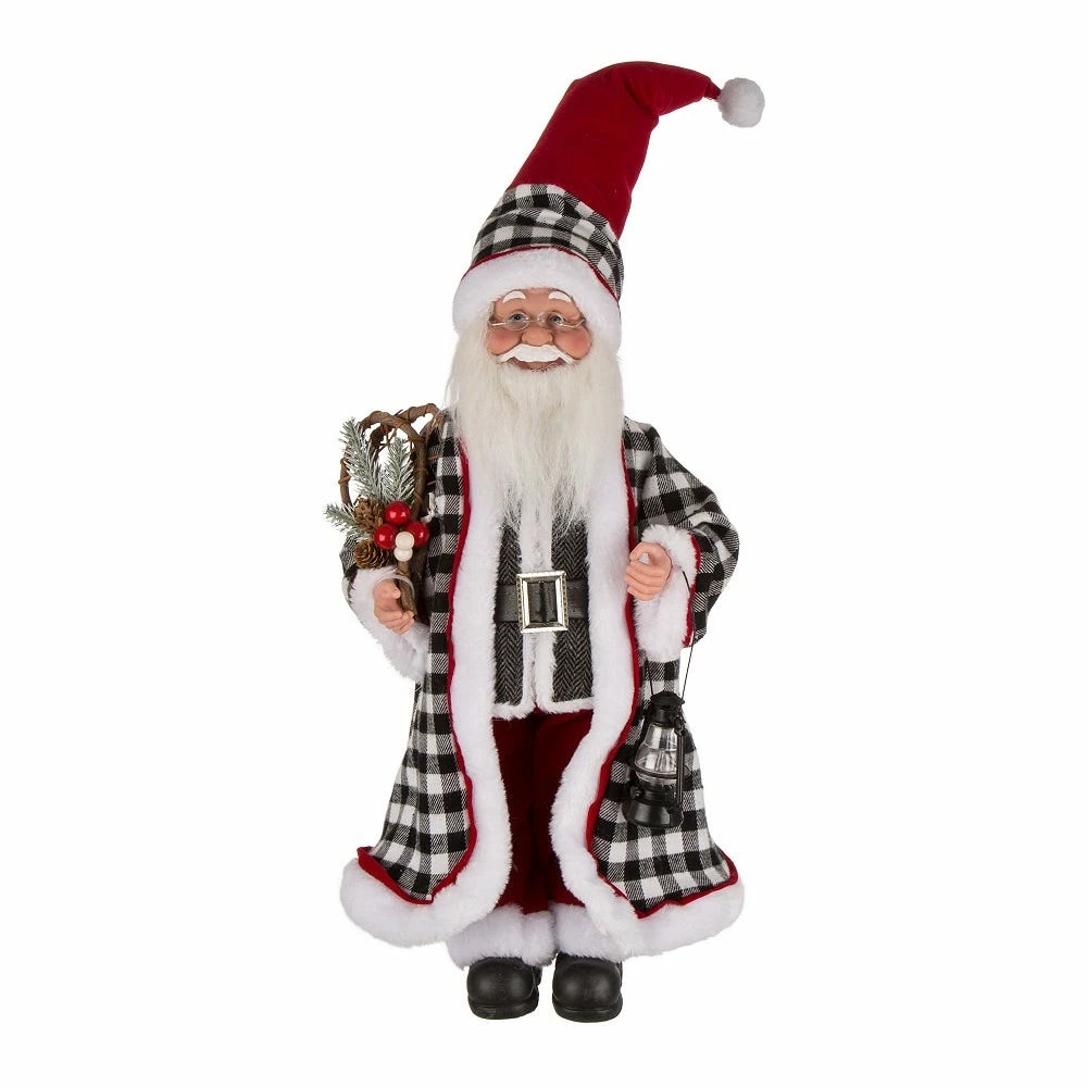 Black and White Plaid Santa Figurine. He dressed in black and white plaid with white trim and red pants and hat. He is holding snowshoes decorated with holly berries in his right hand and a lantern is in his left hand.