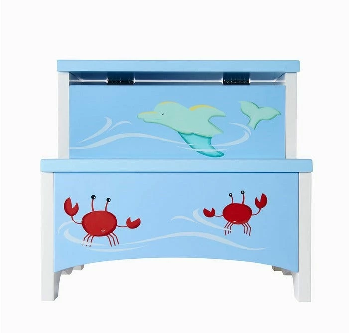 All aboard for a nautical adventure with the Sailing furniture set! This collection features shades of sea, sky, and sandy beaches–decorated with images of cheerful crabs, diving dolphins, soaring seagulls, and sailboats at full mast. This step-stool features storage under the top step, angled back edge to prevent tipping, and cutout handles on the sides for easy carrying. Perfect for bathrooms, kitchens, playrooms or anywhere a little extra height is needed. Adult assembly required. 13″W x 14.5″D x 12.5″H