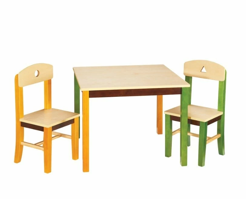 Featuring earth-toned panels and playful shapes, makes this ideal for any playroom, bedroom, or classroom. This three piece tableand chair set offers two chairs with wood veneer seats and backs. One chair features green and espresso posts and legs, and a triangle cutout in the seat back; the other presents orange and espresso legs and posts, plus a circle seat-back cutout. Coordinating table has wood veneer surface and combines green, orange, and espresso legs and trim. Solid birch plywood construction with durable UV polyurethane finish. Adult assembly required.