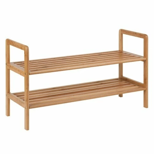 Honey-Can-Do SHO-01600 2-Tier Bamboo Shoe Storage Rack. Â This eco-friendly bamboo shelving unit is the perfect combination of function, versatility, and style. The gorgeous, natural finish is a stunning addition to any decor. The unit can display 8-pairs of shoes beautifully; more for smaller sizes. Open slats allow air circulation, yet are close enough together to hold other items such bags or books. Durable bamboo is also moisture resistant; making this a great storage solution for baskets or towels in a spa-style bathroom.