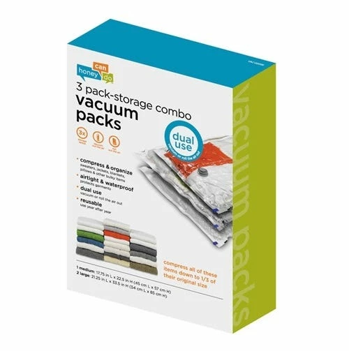 Honey-Can-Do VAC-02058 3-Pack Storage Combo Vacuum-Pack (Multiple Sizes). Vacuum-Packs are vacuum sealed storage bags designed for compacting and storing everything from seasonal clothing to linens. Simply place your items into the bag, attach any hose-style vacuum cleaner, and watch as the air is removed and items compress into a smaller, manageable pack. Honey-Can-Do Vacuum-Packs protect your stored items from dirt, insects, and moisture keeping contents fresh and damage-free. These units are reusable making them an excellent value. Let Honey-Can-Do help you get organized today.