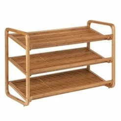 Honey-Can-Do SHO-01599 3-Tier Deluxe Bamboo Shoe Storage Rack, Natural. This eco-friendly bamboo shoe rack is the perfect combination of function and style. The gorgeous, natural finish is a stunning addition to any decor. Crafted to hold shoes, accessories, and bags the shelves are slanted slightly forward and incorporate a front edge lip to display items beautifully. Reverse a shelf during assembly for a flat surface perfect for books, baskets, and more. The open slats allow air circulation yet are close enough together to hold smaller items. Â The unit displays 12-pair of shoes effortlessly; more for smaller sizes.