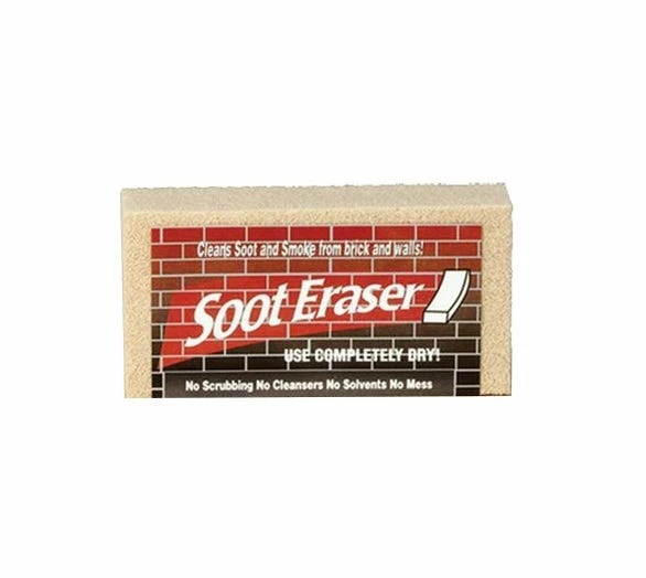 The Soot Eraser Works like an eraser, absorbing smoke residue, soot, fly-ash and dirt. Use It completely dry! No scrubbing, no mess, no solvents, no cleanser! Made from a non-toxic 100% natural vulcanized rubber, the soot eraser works on most surfaces including: brick, mantels fireplace hearths, woodwork, window blinds, window shades, painted walls and most wallpaper.