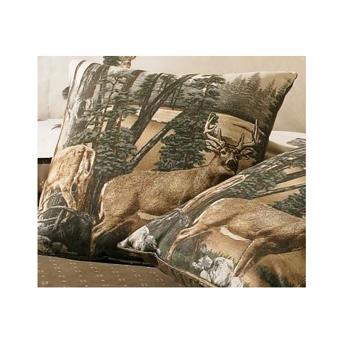 Perfect for the outdoor-inspired decorator. Panoramic scenic border print showcases majestic whitetail deer in their natural habitat. All-natural colors in browns and greens bring the outdoors in. The Square Toss Pillow is reversible with imagery on one side and a coordinating pattern on the reverse side. Made in USA.