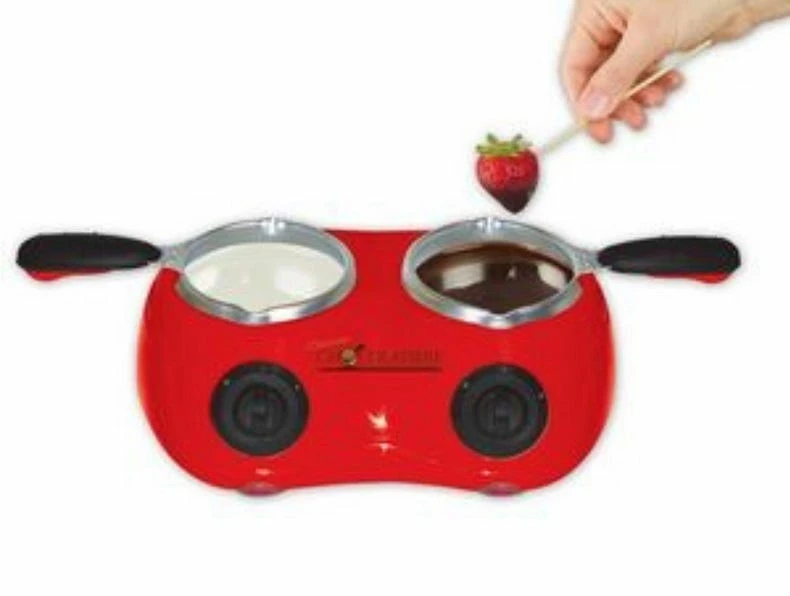 The Deluxe Chocolatiere lets you melt chocolate and make tasty fondues for your friends and family. It is the must-have product for the holiday season and amateur and hobby chefs love its versatility. This electric chocolate melting pot has two independently controlled melting pots. Make white and dark chocolate at the same time. Unlike stove-top fondue pots, the Deluxe Chocolatiere won’t harden or burn chocolate, and you won’t need to turn on your stove or boil water. Just plug in the Deluxe Chocolatiere to create chocolate covered strawberries, peanuts, raisins, coffee beans, or cover your ice cream with chocolate for a home made ice cream bar.