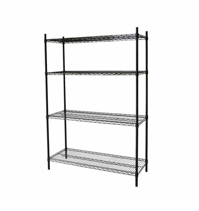 Organize your home with this sturdy Steel Core four-shelf wire shelving unit. Featuring a 350-pound weight capacity and adjustable leveling feet for stability on uneven surfaces, this easy-to-assemble, black-coated chrome steel unit is suitable for any room in your home.