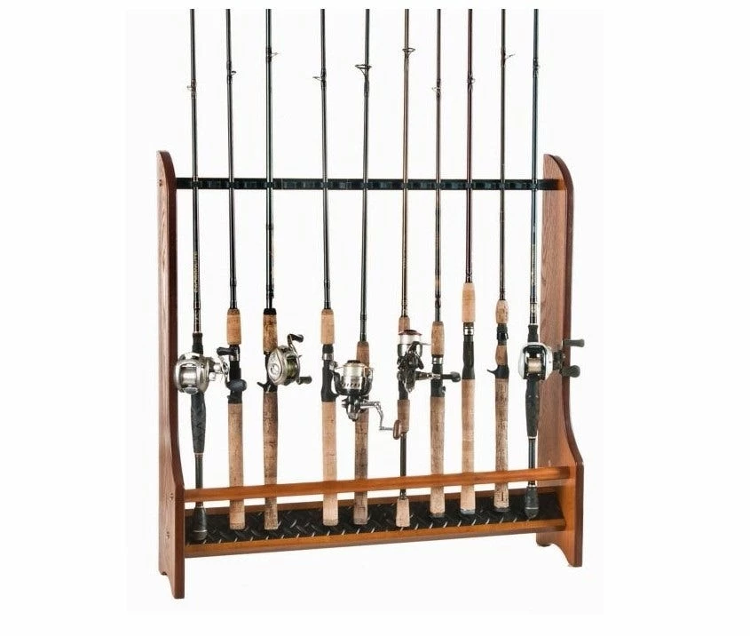 Whether you’re storing customized rods and reels or want to customize the way in which you organize, look no farther than the Organized Fishing Floor Rack. The Track Rack™ system accommodates your specialty rods and the unique construction is unlike anything else on the market. You’ll enjoy the sleek, hardwood oak finish to compliment your game room, living room or garage. Maximize your storage with the Organized Fishing Wood Floor Rack.