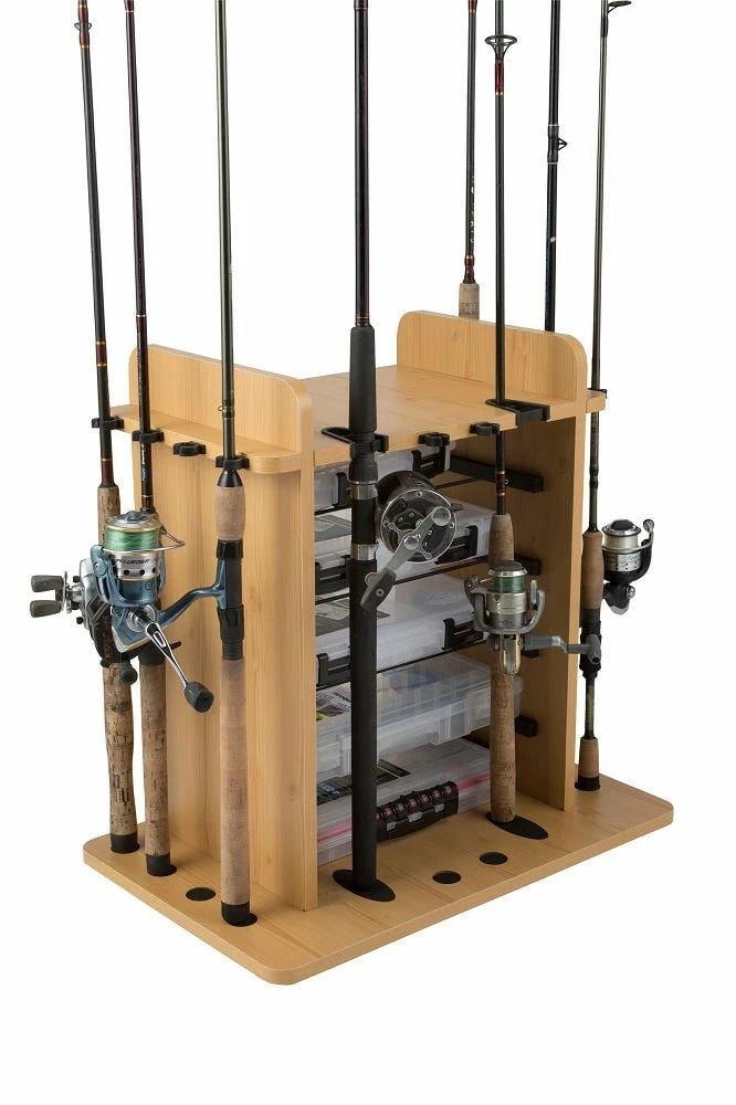 Catch of the day: Reel smart storage that keeps every fisherman’s needs at arms reach. This is a complete rod rack storage system. Innovative dual rod clip technology allows you to store 2 freshwater rods or one saltwater rod with 1.25″ diameter. The adjustable wire racking system can accommodate four 3600/3700 utility boxes (not included). Ten freshwater rod clips adjust to any rod taper. Soft padded slots on base plate for rod handles. Easy to assemble and makes a great addition for beginner or advanced fisherman. The Rack size is 22.83″ x 14.37″ x 23.7″.