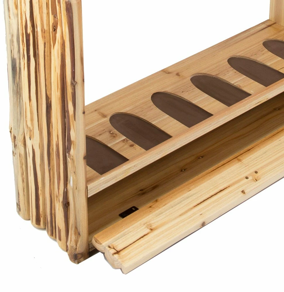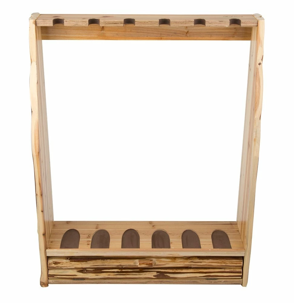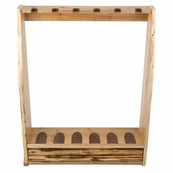 Secure and showcase your hunting supplies without sacrificing valuable space with this attractive Rustic Log 6 Gun Rack with Storage Drawer from Rush Creek Creations. This beautiful, solid pine rack secures and displays up to 6 rifles, shotguns, and other shoulder-shot firearms on a durable and attractive freestanding rack. The wood is given two varnish treatments composed of a skip-peel finish and a polyurethane treatment to protect both the rack and your equipment from scratches or dents without compromising the classic cabin style. The gun groove channels were designed so that each gun rests securely in its place, with the barrel rests lined with felt to protect your collection and guard against damage. A wide base features a handy storage drawer where you can keep ammo, gun oil, and other accessories alongside wherever you store and display your firearms. When assembled, the rack measures 34″L x 9.5″W x 42″H. With its rustic charm and durable, sturdy design, the Rush Creek Creations Rustic Log 6 Gun Rack with Storage Drawer is an essential item for any sportsman and hunting enthusiast. Includes 1 rack. Guns and accessories sold separately.