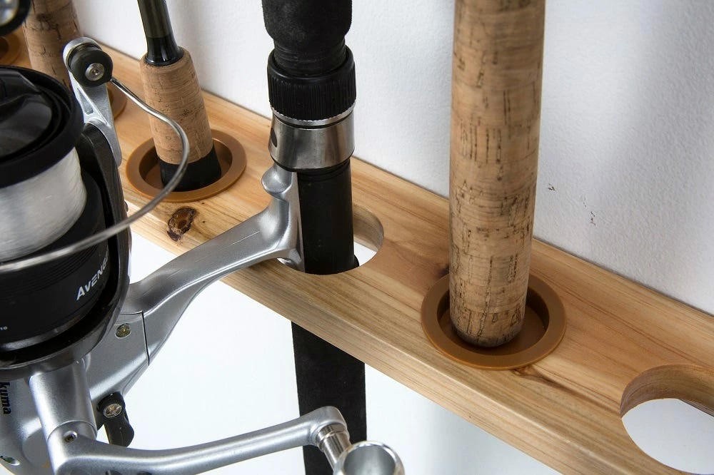 - Can be mounted on wall or ceiling for convenient rod storage