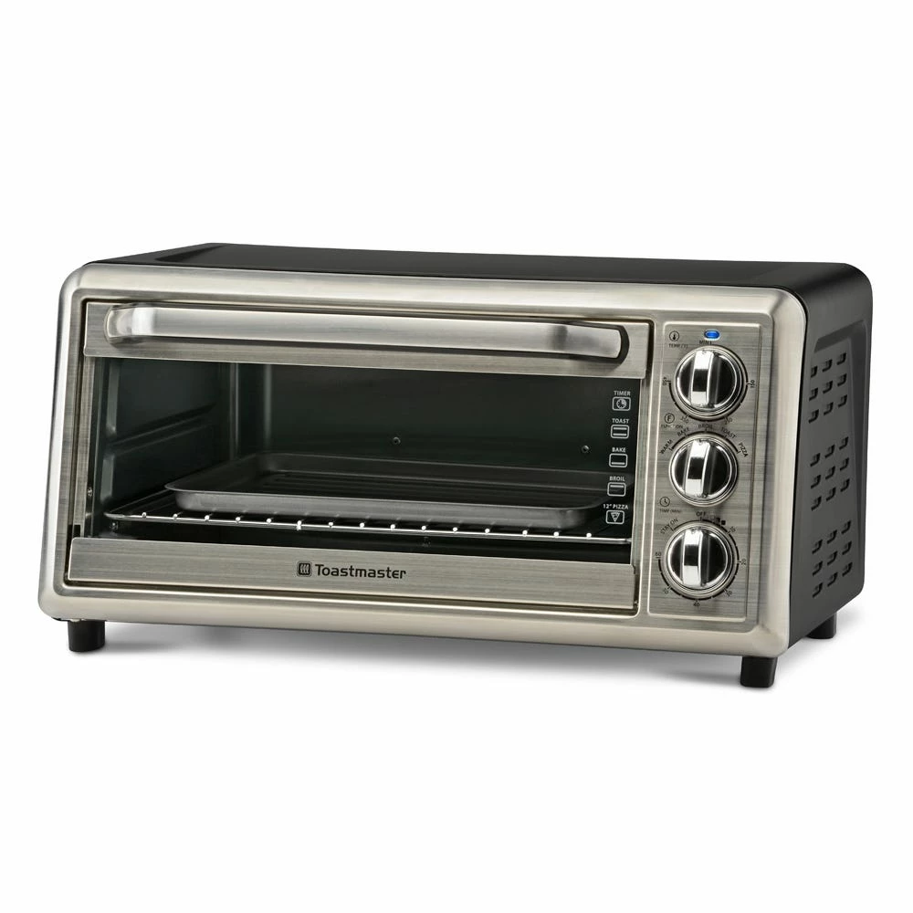Toast bread, bake a pizza, heat up a frozen meal and more. The Toastmaster toaster oven fits up to 6 slices of bread or a 12″ pizza. Multiple cooking functions include Toast, Bake, Warm, Broil and Pizza. Manage your cooking experience with the adjustable temperature control and 60 minute timer and check cooking progress through the glass door.