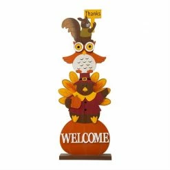 The wooden porch decor features a stacked squirrel,owl,turkey,Pumpkin. Designed with vibrant colors. colorful wings and 3D mouth, It looks like a funny gentleman standing at the door.Material in MDF and solid wood. Size 14.17″L X 3.94″W X 40.35″H