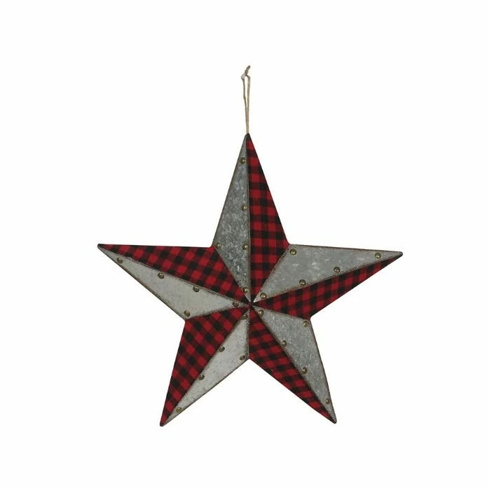 - The star features a galvanized upper half and a buffalo plaid bottom half with rivet details at the corners, The design makes a unique addition to your holiday decor anywhere in your home.