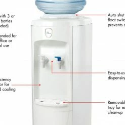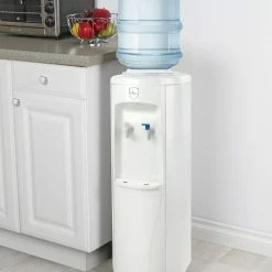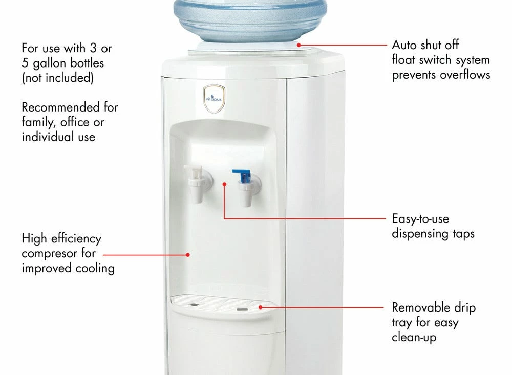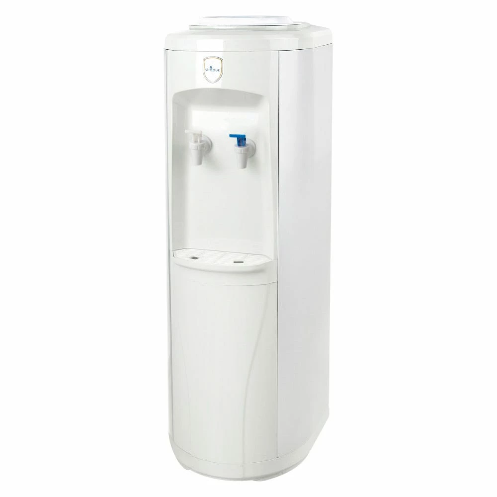 The Vitapur Floor Standing Water Dispenser dispenses room and cold water and can be used with a 3 or 5 gal water bottle or the Vitapur Water Filtration System. The high-efficiency compressor helps provide icy cold water on demand. This water dispenser also features an adjustable cold water thermostat.