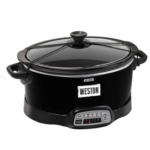 This Weston7 Quart Programmable Slow Cooker has a fully customizable display with an adjustable time setting from 2 to 10 hours. Includes a Lid Latch strap for spill-free travel to the tailgate or family gathering. Outfitted with oval-shaped, dishwasher safe stoneware that’s ideal for cooking a whole bird or roast to tender perfection. Perfect size for a 7 lb chicken or 5 lb roast. Dishwasher safe crock & lid.