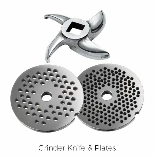 - Two stainless steel grinding plates: Coarse (7mm) and Medium (4.5mm)